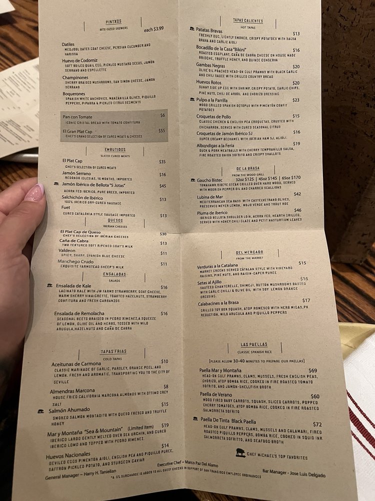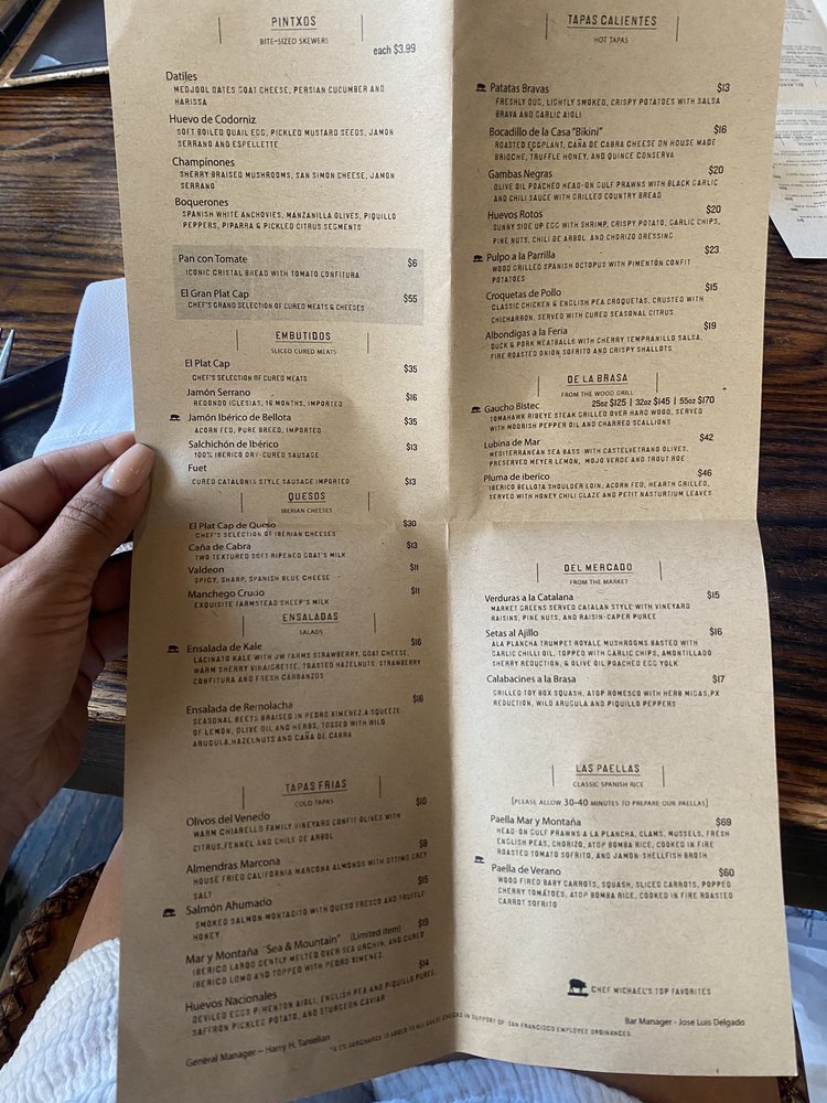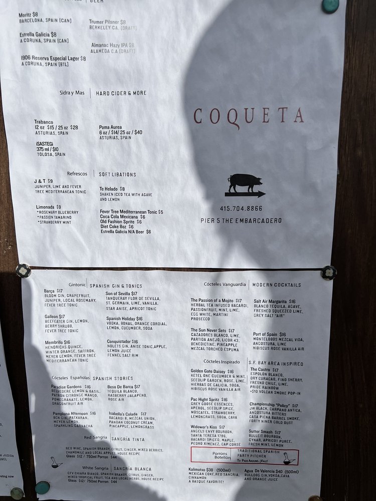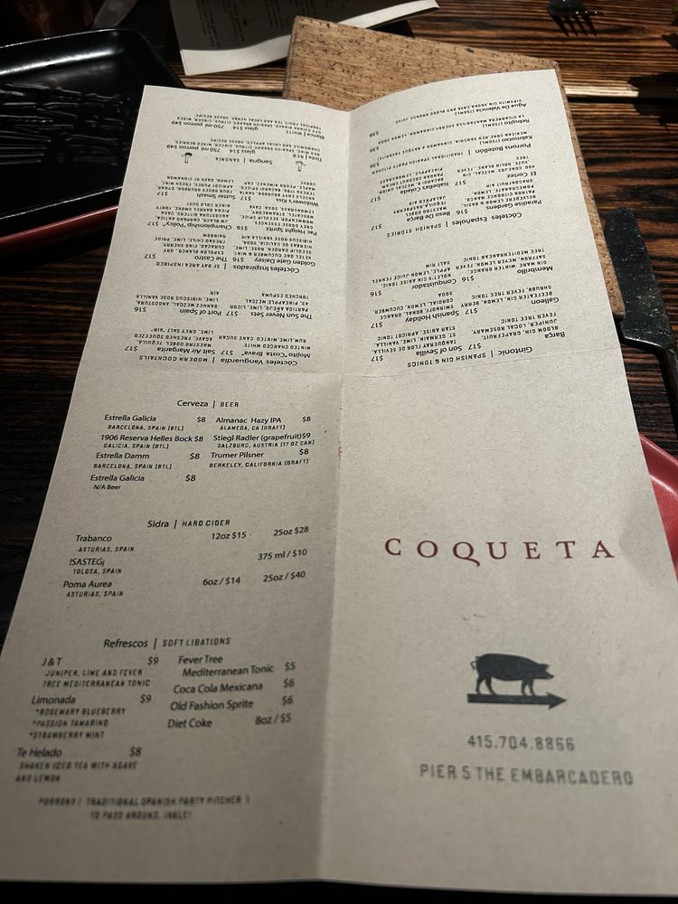 Coqueta, a Spanish tapas/ small plates restaurant located at The Embarcadero Pier 5 in San Francisco, offers a trendy dining experience with a variety of vegan and limited vegetarian options. The menu features dishes like Grilled little Gem Lettuce with Chicken essence and toasted Hazelnuts, Roasted Brussels sprouts with Romesco, and Sherry-infused watermelon with boquerones and feta. Customers praise the perfect 5-star service, cozy ambiance, and ocean views. Highlights include the salt and air margarita, crispy calamari PoBoy, black garlic prawns, and Manchego cheesecake lollipops. Despite small portions, the dishes are flavorful and well-executed. Coqueta's gender-neutral restrooms, heated outdoor seating, and reusable tableware add to its charm. Don't miss out on the delightful experience and exquisite flavors at Coqueta.